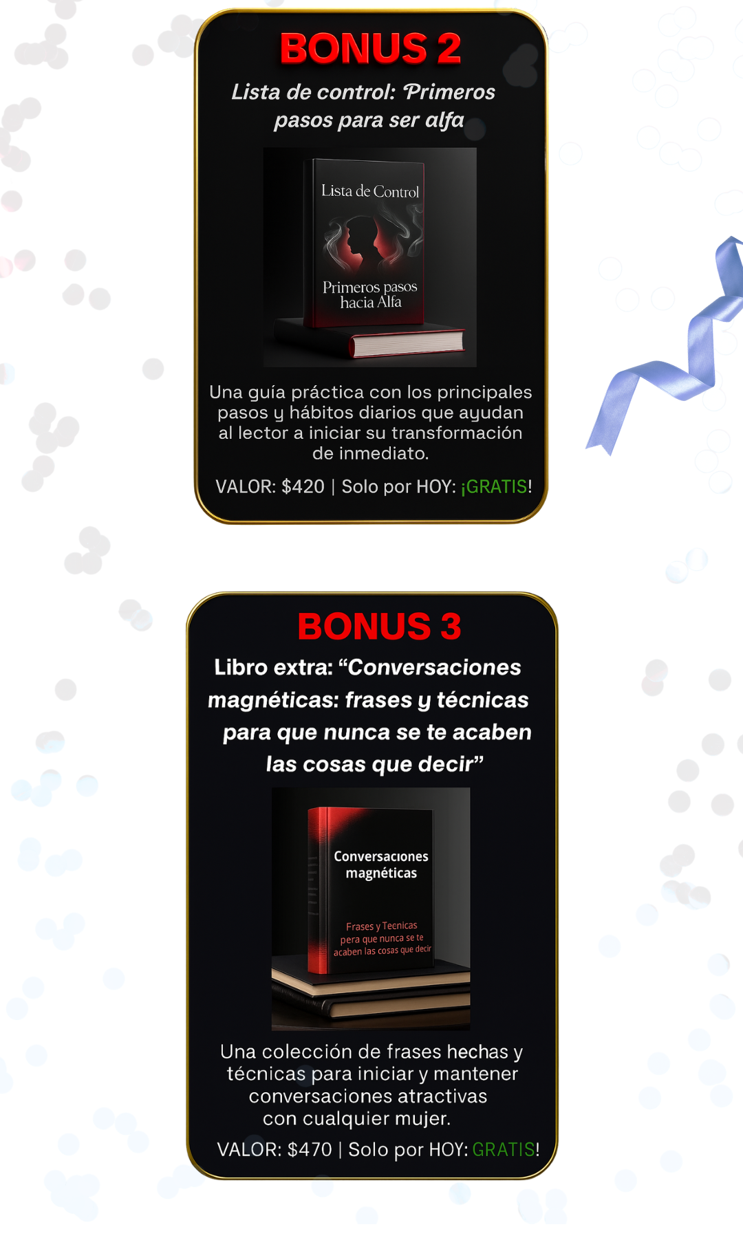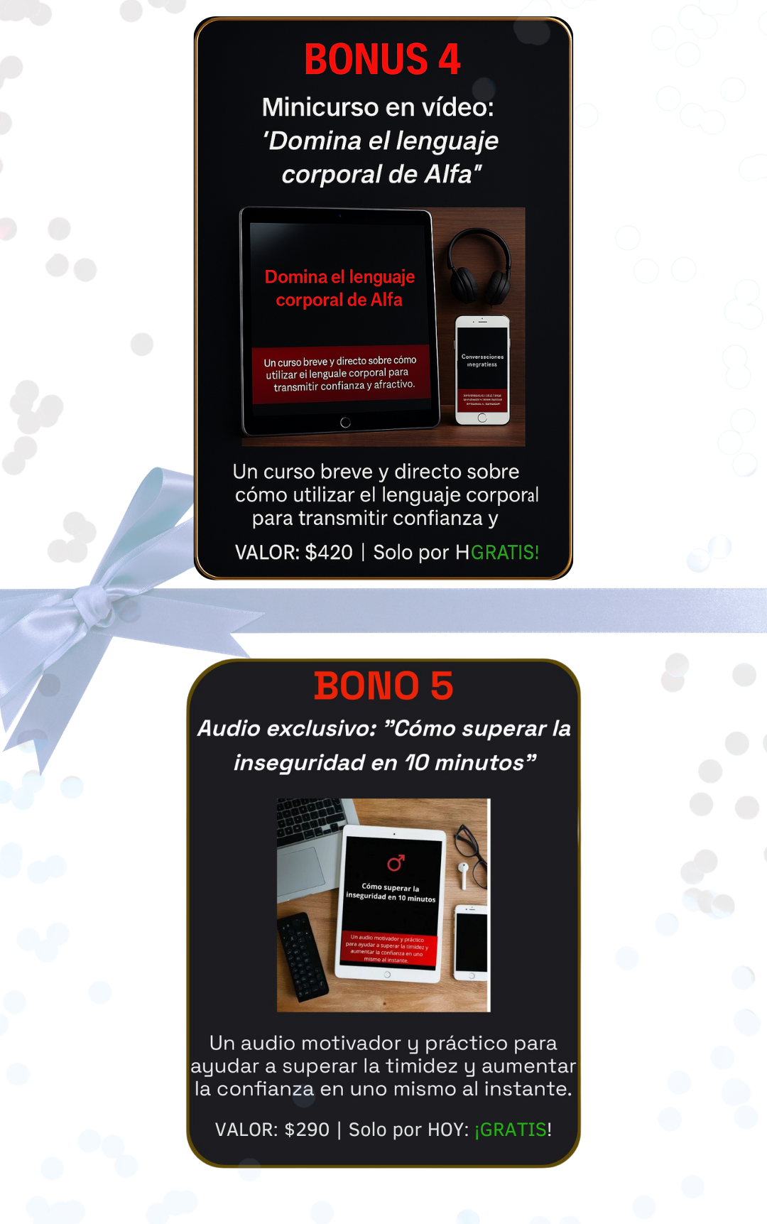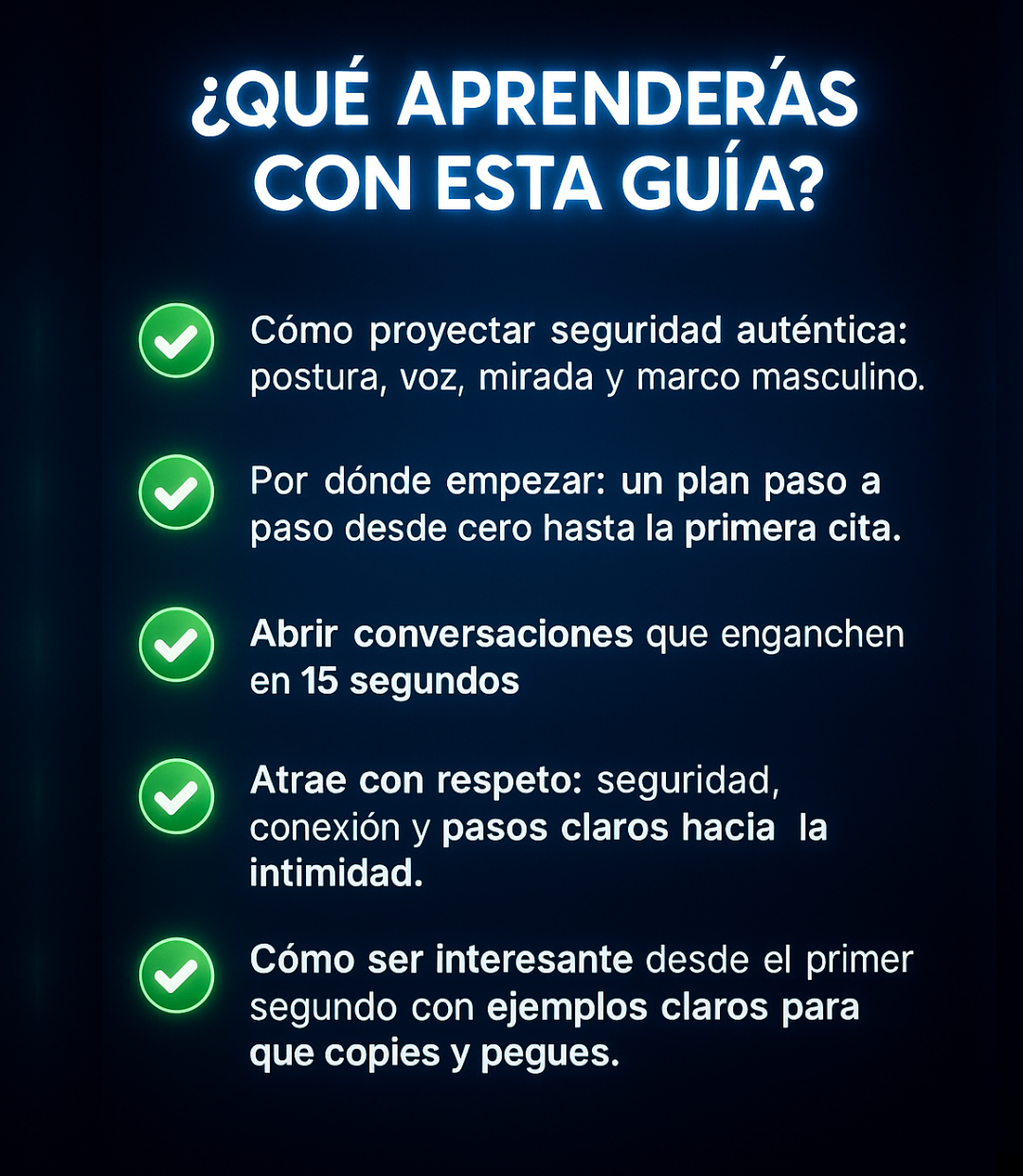 Vas a descubrir una guía paso a paso para atraer mujeres de verdad, sin fingir, sin actuar raro y sin depender de la suerte. Te voy a enseñar cómo desarrollar seguridad, carisma y mentalidad para convertirte en un hombre irresistible.